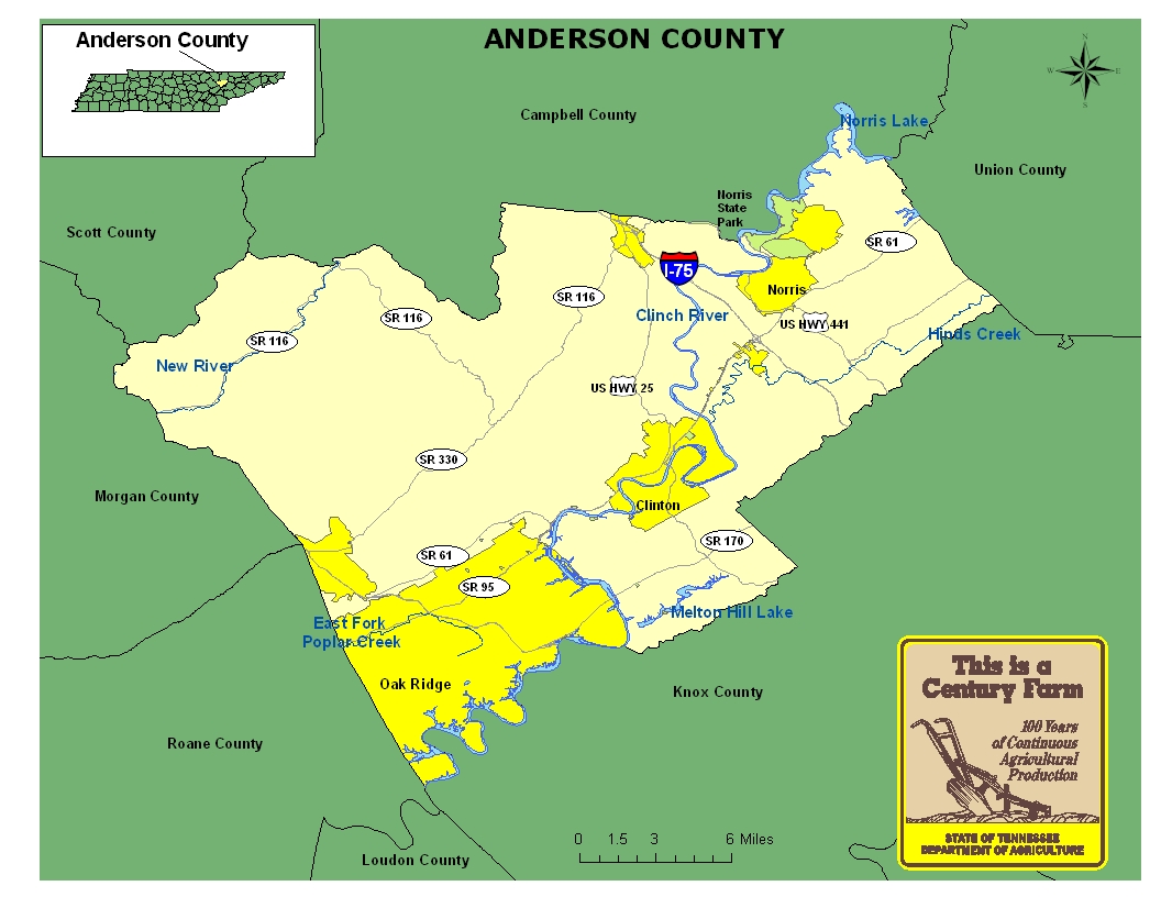 Once known for agriculture and coal mining as its leading industries, the county was propelled to national prominence in the 1930s with the introduction of the Tennessee Valley Authority and the construction of Norris Dam. During the years of World War II, Anderson County gained national and international attention when federal planners established the city of Oak Ridge, a site for the development of nuclear facilities. For more information on the history of Anderson County, please go to the Tennessee Encyclopedia of History & Culture website.