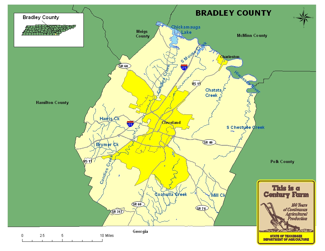 Bradley County is located in southeast Tennessee and shares its southern boundary with the state of Georgia. The county was founded in 1836 and was named in honor of Colonel Edward Bradley, a Revolutionary War veteran who served with Andrew Jackson during the War of 1812. The city of Cleveland is the county seat. One of the top tourist attractions in the county is the Red Clay State Historical Area, an interpretive center for the Cherokee removal known as the Trail of Tears. For more information on Bradley County, please go to the Tennessee Encyclopedia of History & Culture website.