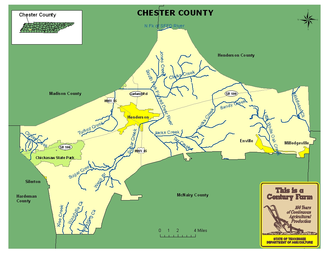 Chester County was formed in 1882 and was created from parts of neighboring Hardeman, Henderson, McNairy, and Madison counties. The county was named after Colonel Robert I. Chester, a quartermaster in the War of 1812, an early postmaster in Jackson, and a federal marshal for the Western District. The county seat, Henderson, was founded along the Mobile and Ohio Railroad line in the late 1850s. The county has primarily been an agricultural region for most of its history. During the New Deal era of the 1930s, a large portion of the western end of the county became part of Chickasaw State Park and Forest project of the Farm Security Administration. For more information regarding Chester County, please go to the Tennessee Encyclopedia of History & Culture website.
