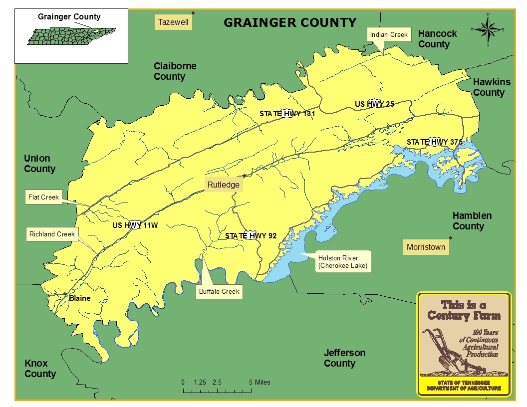 Grainger County was formed in 1796 from parts of Hawkins and Knox counties and holds the distinction as the only Tennessee county named for a woman, Mary Grainger Blount, the wife of Territorial Governor William Blount. Grainger County’s seat is Rutledge and is located 32 miles northeast of Knoxville. For more information regarding Grainger County, please go to the Tennessee Encyclopedia of History & Culture website.