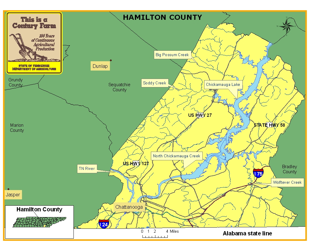 Hamilton County was established in 1819 and was named in honor of Alexander Hamilton, Secretary of the Treasury in George Washington’s administration. The county seat is Chattanooga, a city that has been significant in Tennessee’s railroad transportation history. As a prominent rail center, Chattanooga became a focal point during the Civil War. Chattanooga also has many tourist attractions such as Rock City, Ruby Falls, the Incline Railway on Lookout Mountain, the Chattanooga Choo Choo family entertainment complex, and the Tennessee Aquarium. In addition, to its tourist attractions, Hamilton County has many industries and businesses such as a Coca-Cola bottling franchise, DuPont, McKee Baking, and Combustion Engineering. For more information regarding Hamilton County, please go to the Tennessee Encyclopedia of History & Culture website.