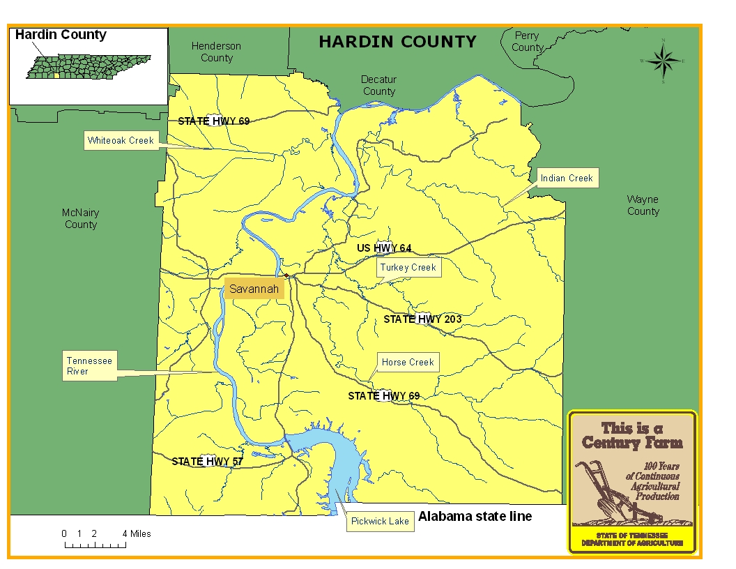 Hardin County was created in 1819 and was named for Colonel Joseph Hardin who participated in the Revolutionary War and served as a representative of Washington and Greene counties in the early years of statehood. The county seat is Savannah. During the Civil War, the Battle of Shiloh took place in the area between Shiloh Church and Pittsburg Landing. Today, the area is commemorated by a 3,000 acre national park. For more information regarding Hardin County, please go to the Tennessee Encyclopedia of History & Culture website.
