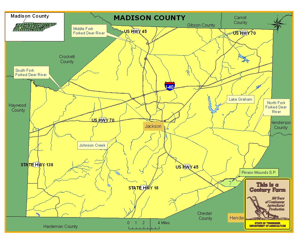 Madison County was established in 1821 and its county seat is Jackson. Prior to the establishment of the county, the area was home to Native Americans such as the Woodlands who developed large mound villages. These mounds, known as the Pinson Mounds, are the largest Middle Woodland period mound group in the United States. In addition to the mounds, the county is notable for having three railroads and being the home of legendary Illinois Central Railroad engineer Casey Jones. The county is also the home of Lambuth University, Union University, Lane College and Jackson State Community College. For more information regarding Madison County, please go to the Tennessee Encyclopedia of History & Culture website.
