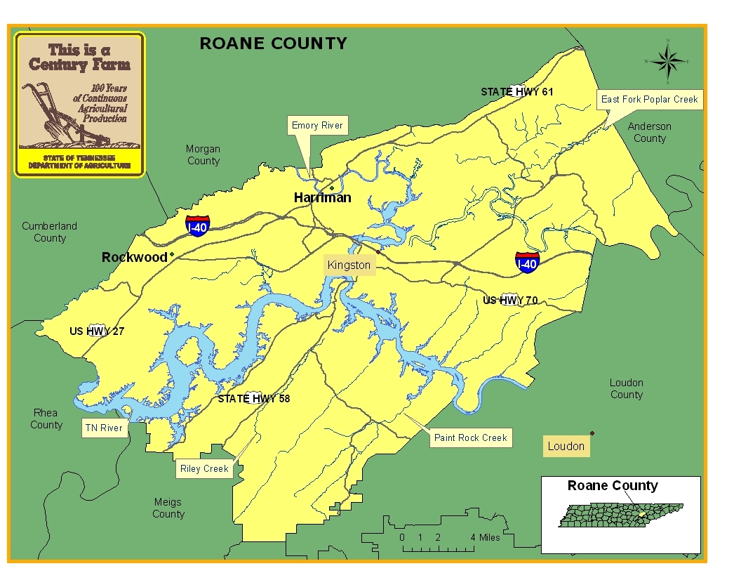Roane County was established in 1801 and named in honor of the second governor of Tennessee, Archibald Roane. The town of Kingston serves as the county seat. The county’s location at the juncture of the Tennessee, Clinch, and Emory rivers made the area vitally important for both white settlers and Native Americans in the early years of Tennessee’s history. Another notable town in the county is Harriman. During the 1890s, Harriman was established by industrialists who were strict prohibitionists. These prohibitionists implemented their beliefs by making every contract or deed sold stipulate a provision forbidding the use, making, storage or selling of intoxicating beverages. For more information regarding Roane County, please go to the Tennessee Encyclopedia of History & Culture website.
