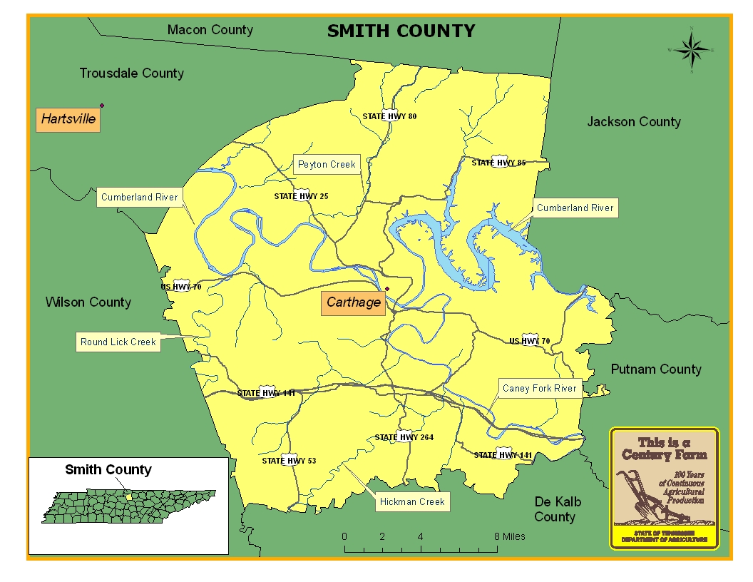 Smith County was established in 1799 and was named in honor of General Daniel Smith. Carthage serves as the county seat and the town’s courthouse is listed on the National Register of Historic Places. During the steamboat era, Carthage served as an important port and trade center. For most of its history, Smith County’s industry has been associated with farm products such as distilleries, grist and flour mills, tanneries, saltpeter, tobacco and timber. For more information regarding Smith County, please go to the Tennessee Encyclopedia of History & Culture website.