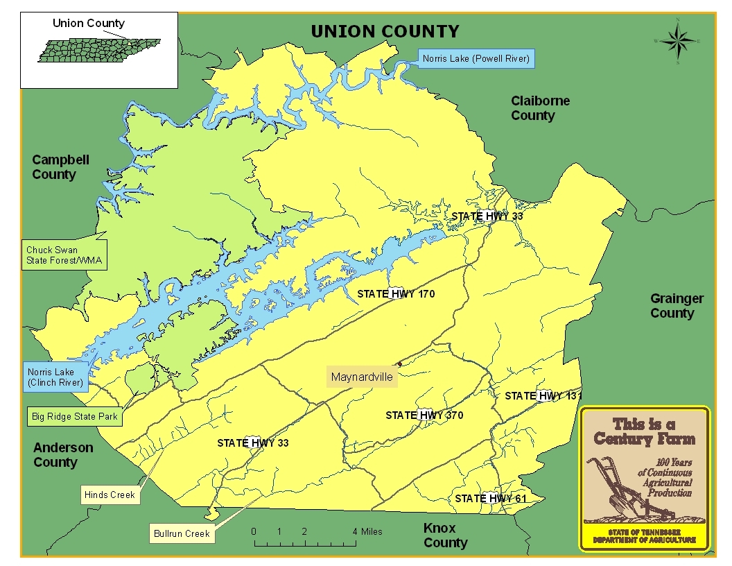 Union County was created in 1856 and the county seat is named Maynardville. The Norris Dam project had a dramatic impact on the county by providing jobs but it also displaced many people who owned land in the floodplains. For a large portion of its history, farming and agriculture were the main occupations of many of the residents. However, in recent years many residents of the county are commuting to jobs in the Knoxville metropolitan area. For more information regarding Union County, please go to the Tennessee Encyclopedia of History & Culture website.