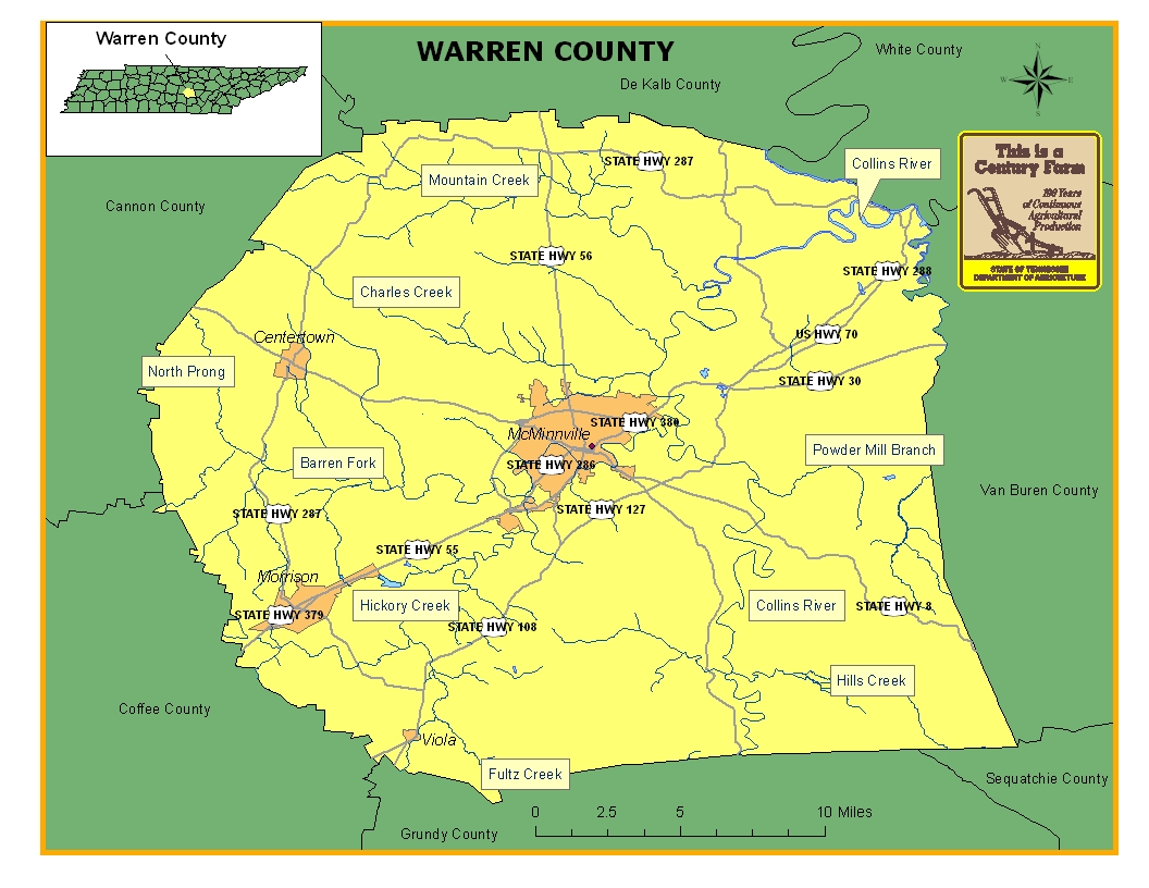 Warren County was established in 1807 and was named in honor of General Joseph Warren, the first general killed in the War of Independence and its county seat is McMinnville. The county has a notable lumber industry and a nursery industry that have provided support for the county’s economy. The county is also home to Rock Island State Park where many residents find recreational opportunities. For more information regarding Warren County, please go to the Tennessee Encyclopedia of History & Culture website.