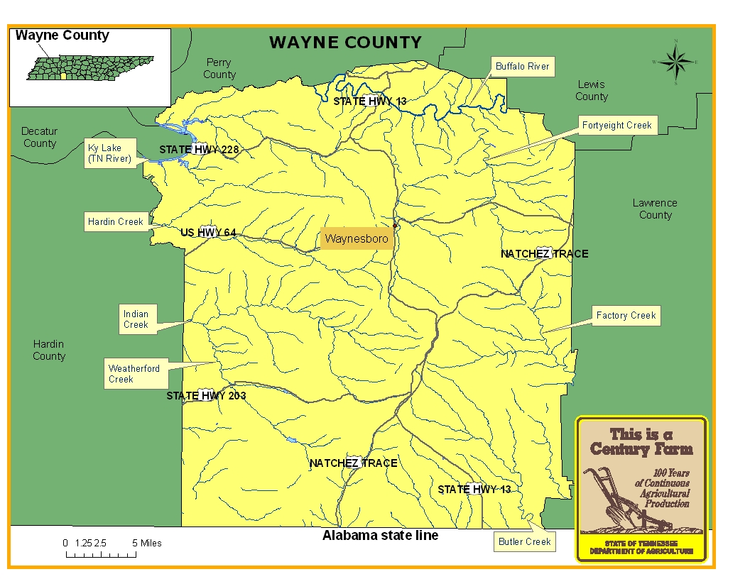 Wayne County was established in 1819 and was named for General “Mad” Anthony Wayne of the Revolutionary War. Waynesboro serves as the county seat. During the nineteenth century, another town known as Clifton had a river that served as an important commercial location for shipping and receiving goods. For more information regarding Wayne County, please go to the Tennessee Encyclopedia of History & Culture website.